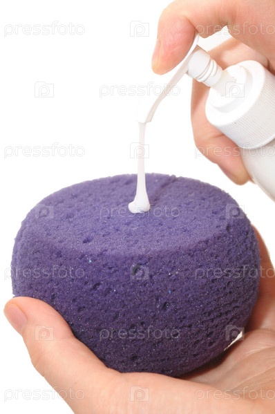 Средство для мытья посуды на мочалке на белом фоне