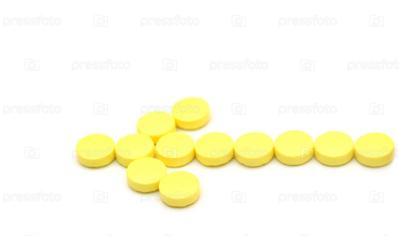 Таблетки, выложенные в форме стрелки, на белом фоне