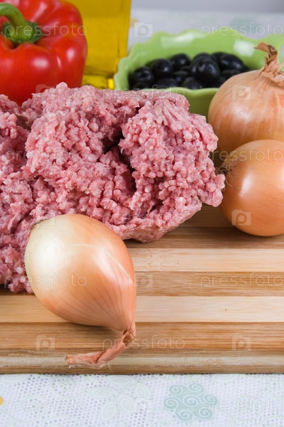 Мясной фарш и свежие овощи на разделочной доске
