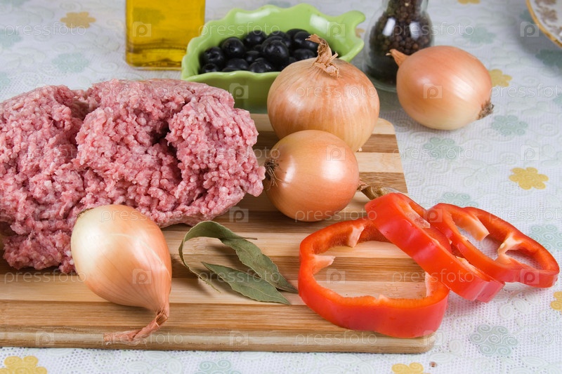 Мясной фарш, специи и свежие овощи на разделочной доске