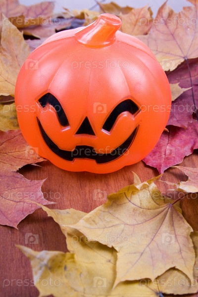 Тыква для Хеллоуина на фоне осенних листьев