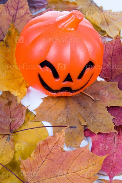 Тыква для Хеллоуина на фоне осенних листьев