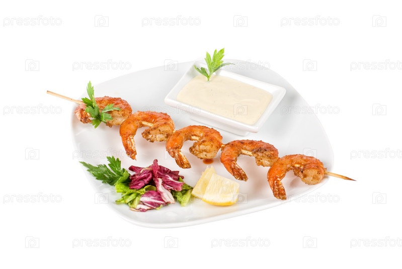 Жареный шашлык из креветок с овощами и соусом