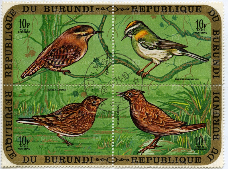 Почтовая марка Республики Бурунди с изображением птиц на зеленом фоне