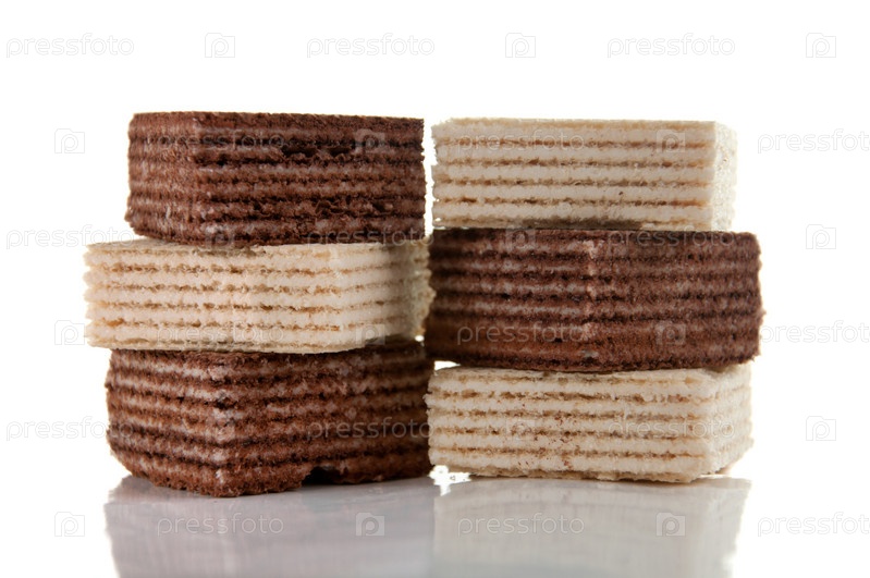 Шоколадные и сливочные вафли на белом фоне