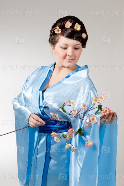 Девушка в голубом кимоно с ветвью сакуры в руках