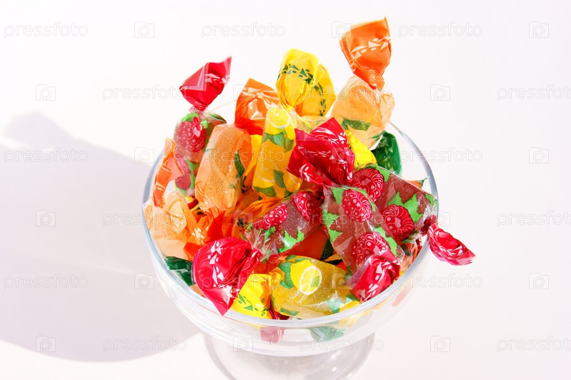 Стеклянная ваза с конфетами в ярких обертках на белом фоне