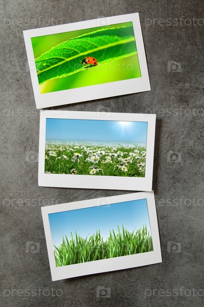 Три фотографии с изображением природы лежат на сером фоне