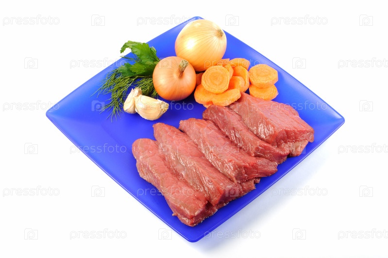 Свежая сырая говядина на синей тарелке, на белом фоне