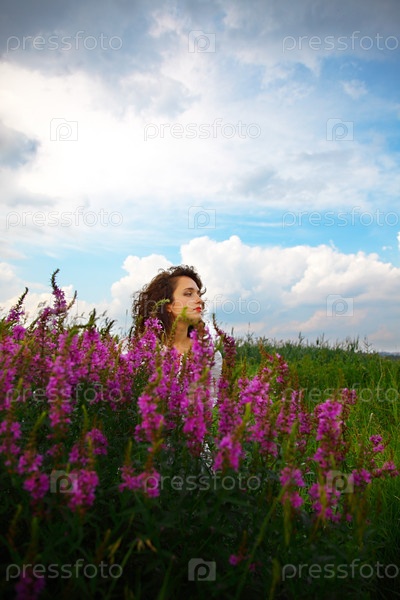 Красивая молодая женщина на поляне с цветами
