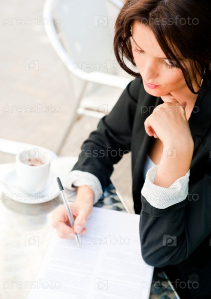 Красивая женщина в деловом костюме заполняет документы, сидя в кафе