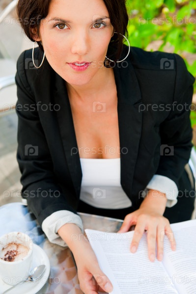 Красивая женщина в деловом костюме читает книгу, сидя в кафе