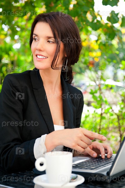 Красивая женщина в деловом костюме сидит в кафе с ноутбуком