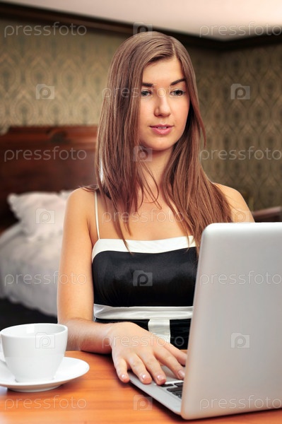 Молодая девушка сидит в спальне с ноутбуком