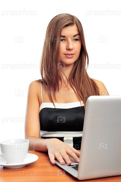 Молодая девушка с ноутбуком на белом фоне