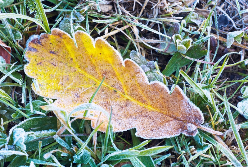 Сухой лист дуба, покрытый инеем на зеленой траве