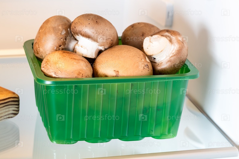 Грибы в холодильнике с открытой дверью