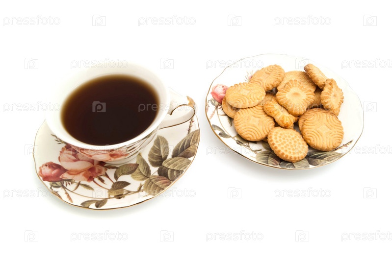 Чашка чая и вкусное печенье на белом