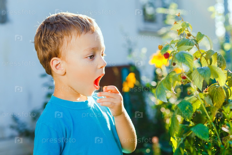 Прелестный маленький мальчик ест малина