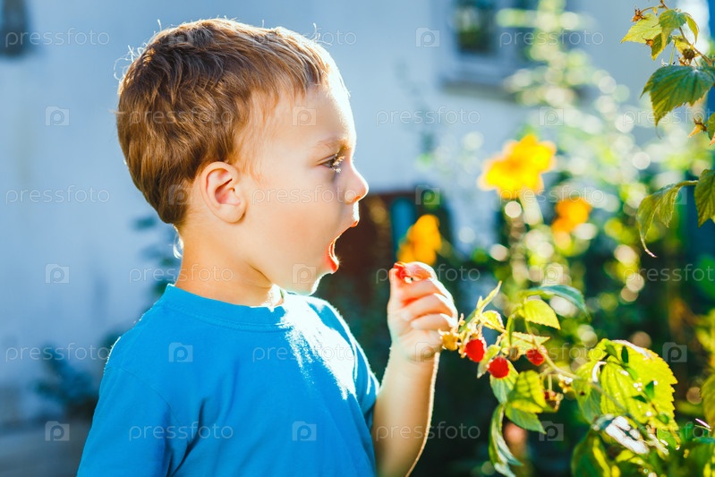 Прелестный маленький мальчик ест малина