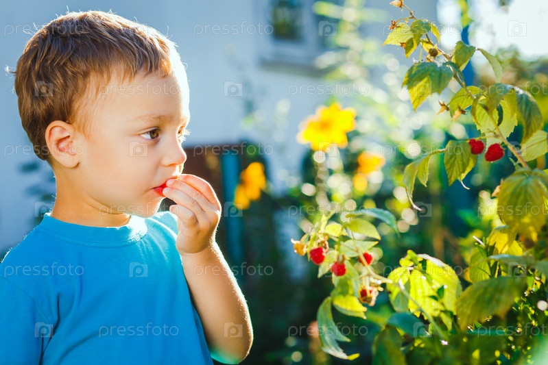 Прелестный маленький мальчик ест малина