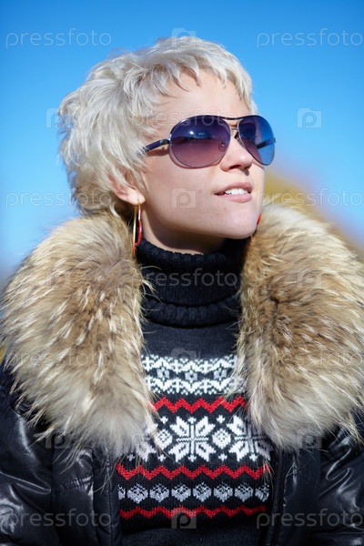 Портрет молодой симпатичной блондинки в солнцезащитных очках
