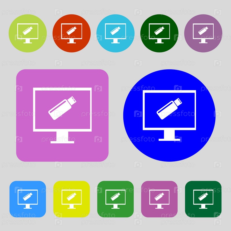 Флэш-накопитель USB и монитор Знак значка. Символ видеоигры. 12 цветовых кнопок. Плоский дизайн. Вектор