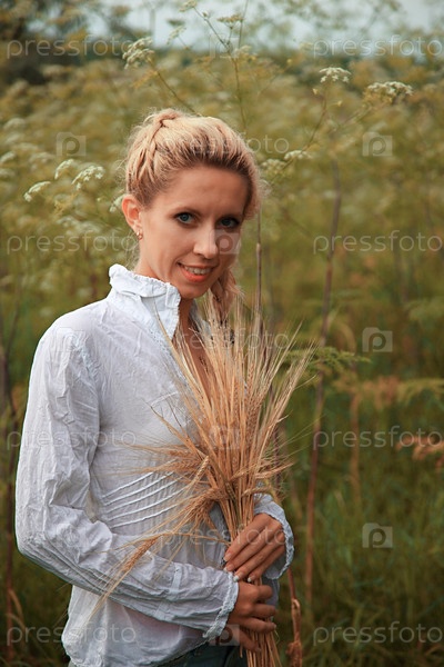 Молодая женщина с колосьями пшеницы в руках в поле