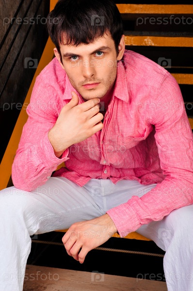 Привлекательный молодой человек сидит на ступеньках