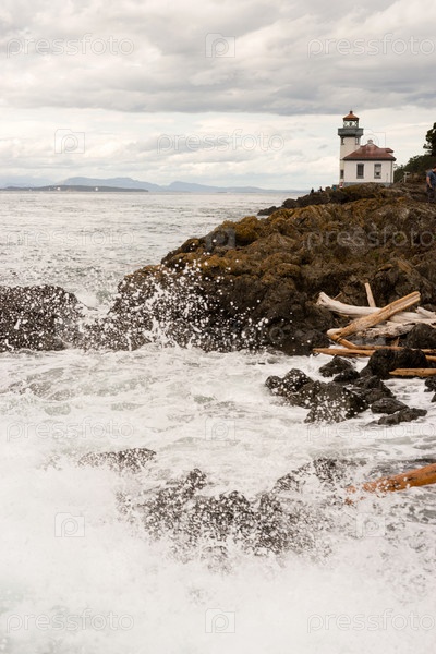 Волны бьются о скалы, где расположен маяк