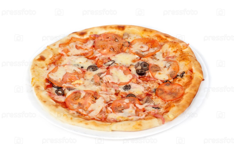 Мясная пиццы крупным планом с карбонадо ветчиной, помидоры, оливки и сыр моцарелла