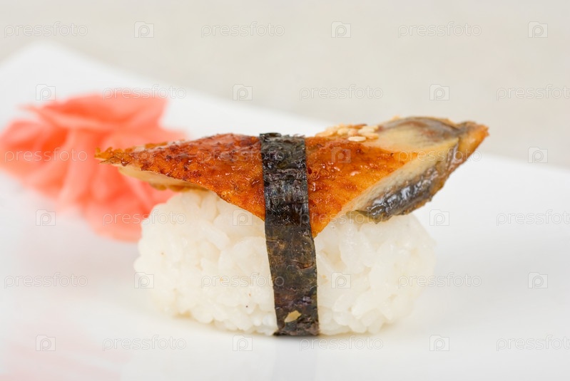 Унаги суши из угря с имбирем, водорослями и кунжутом