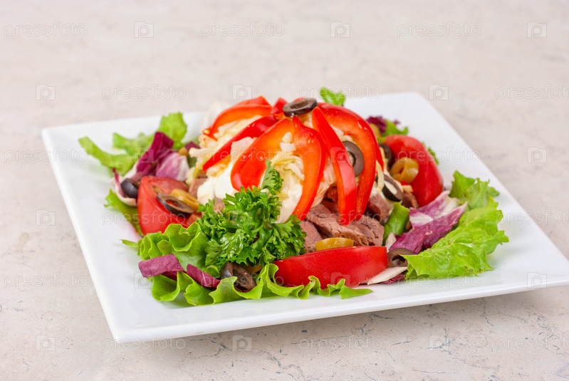 Острый салат из жареной говядины с картофелем, помидорами, капустой, перцем и листьями салата