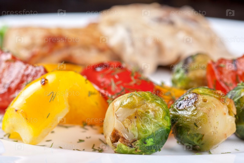 Овощи гриль с грибным соусом и стейк из свинины