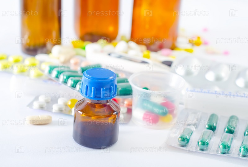 Цветные таблетки и медицинские бутылки
