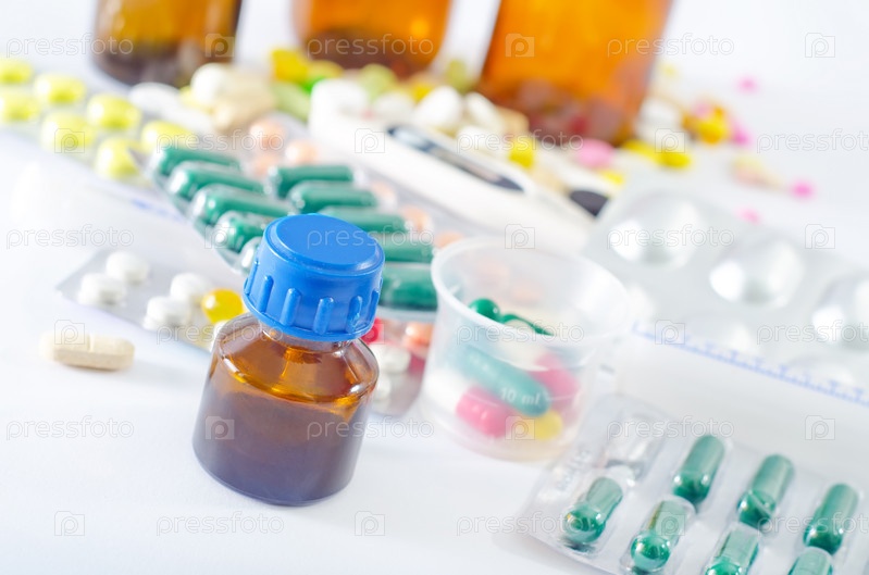 Цветные таблетки и медицинские бутылки