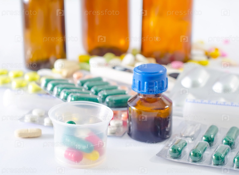 Цветные таблетки и медицинские бутылки