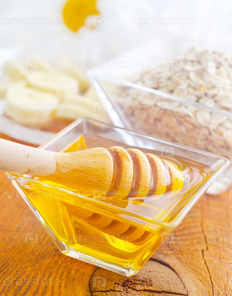 Мед в стеклянную кастрюлю на деревянный стол