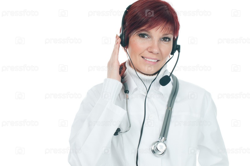 Доброжелательная молодая женщина-врач с гарнитурой на белом фоне