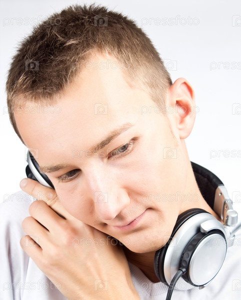 Портрет красивого молодого человека с наушниками, на сером фоне