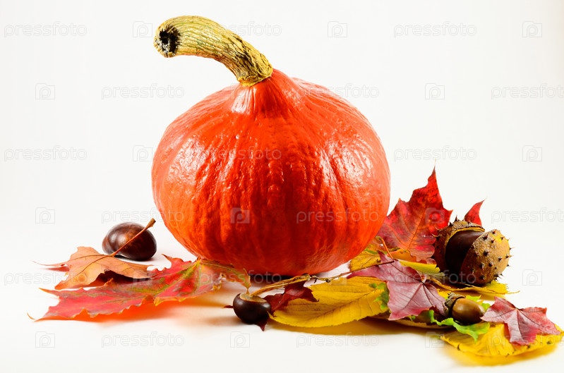 Оранжевая тыква, каштан, орехи и осенняя листва на белом фоне