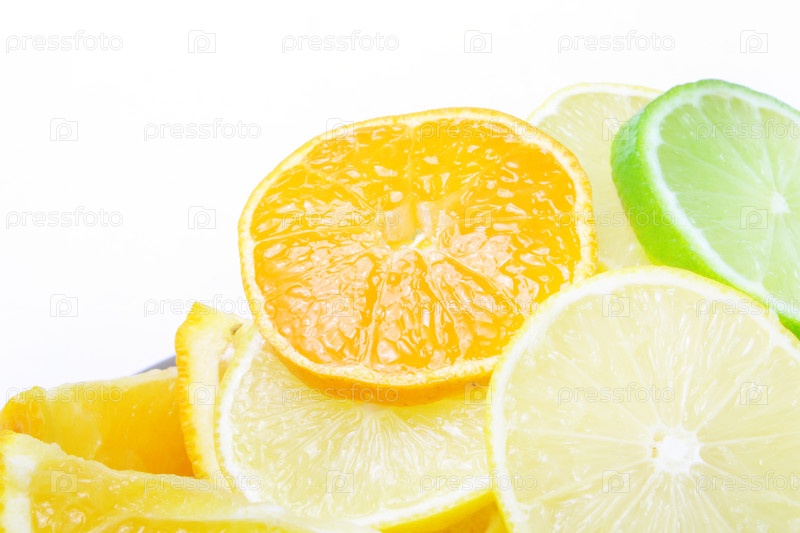 Свежие спелые фрукты (лимон, мандарин, лимон) на белом фоне (изолированные)