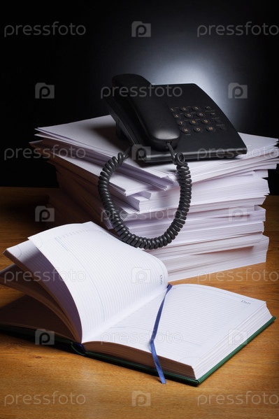 Телефон на стопке документов и открытый ежедневник