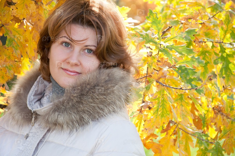 Женщина средних лет на фоне осенних листьев