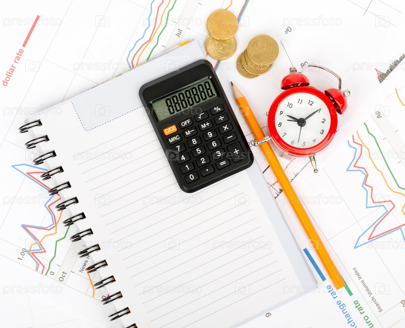 Будильник, пустой блокнот и калькулятор