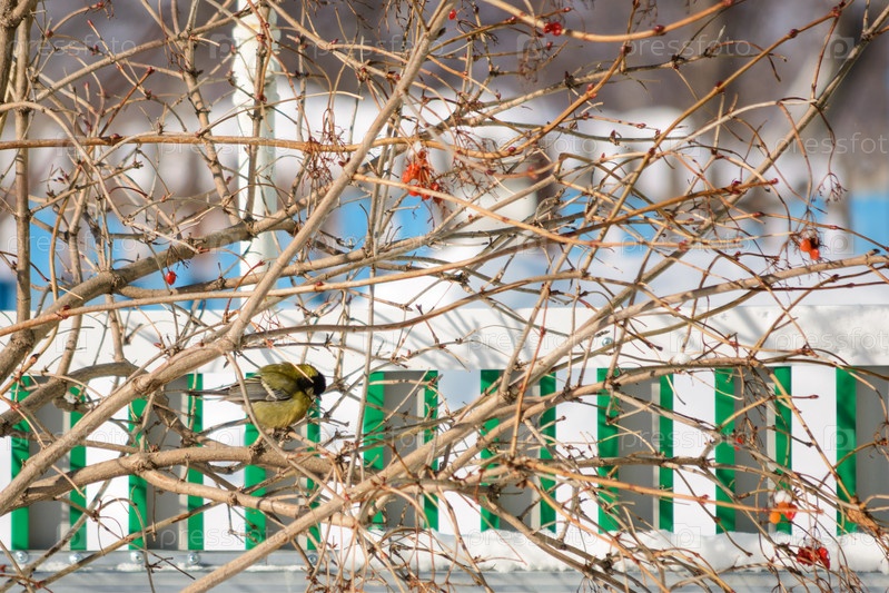 Синица на ветке калины