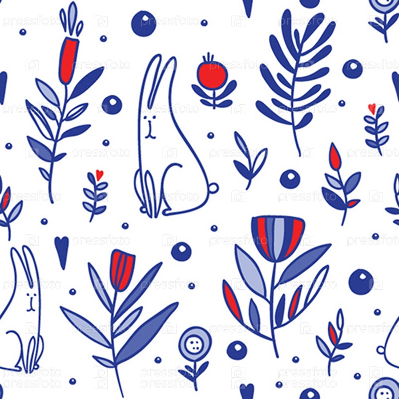 Бесшофный кобальтовый паттерн с цветами и кроликами
