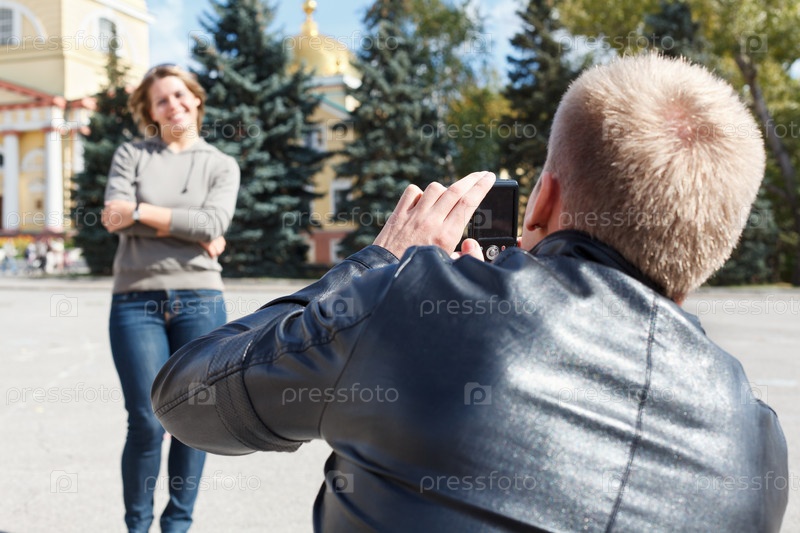 Молодой парень, фотографирующий девушку на фоне достопримечательностей города