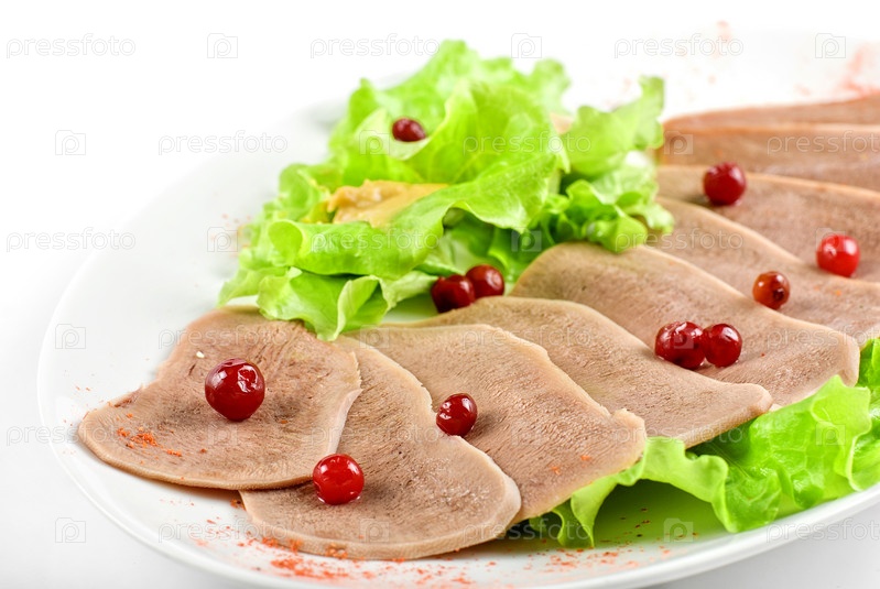 Язык говяжий с клюквой и листьями салата