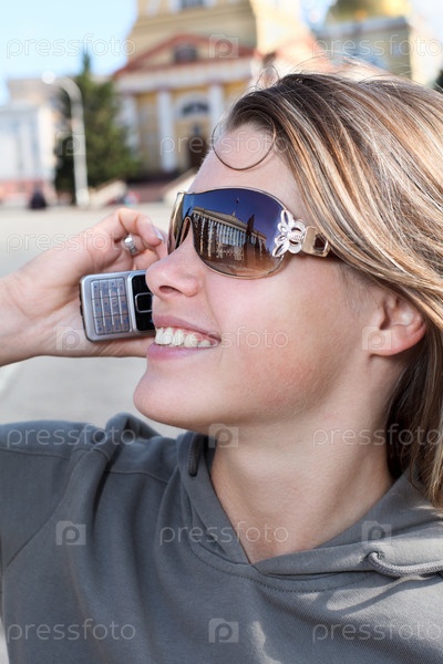Молодая красивая девушка с сотовым телефоном на фоне городских достопримечательностей